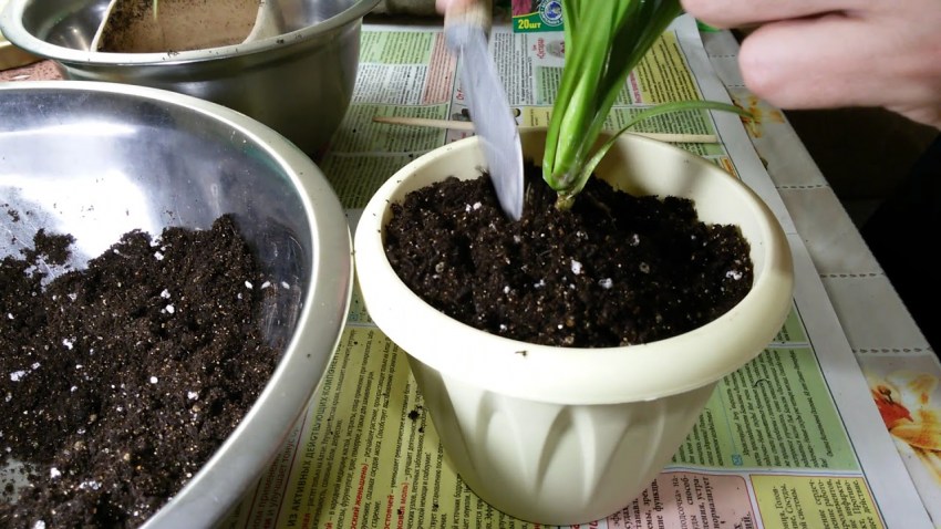 Transplantasjonen utføres etter omlasting med en gammel jordklump. Først legges et dreneringslag av utvidet leire på bunnen av en ny gryte, deretter plasseres et palme sammen med den gamle jorda og drysses med den nødvendige mengden ny jordblanding.