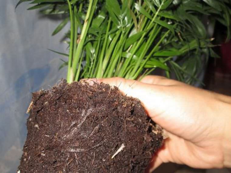 Du kan få et nytt anlegg ved å dele busken. Denne metoden brukes når en voksen håndflate er for tett befolket med stilker. Med denne typen reproduksjon dumpes hele planten forsiktig ut av potten, hvorpå rotkulen deles i to eller tre.