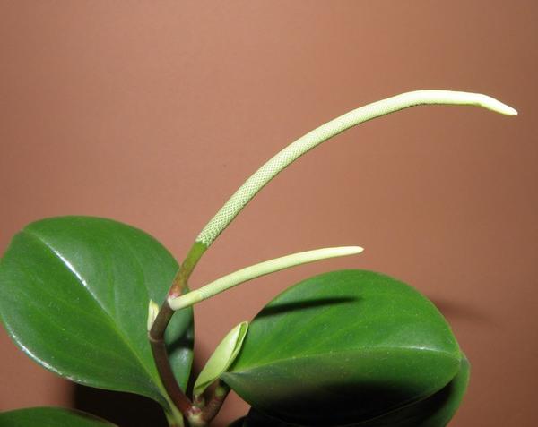 Blomsten er av liten interesse da den er ydmyk. Små blomster uten perianth dukker opp, samles i blomsterstand som et øre eller spikelet. Peduncles må kuttes, da de fører til utarming av planten og ikke har noen dekorativ effekt. Noen ganger er det verdt å beskjære dem i begynnelsen, slik at peperomia ikke kaster bladene etter blomstring.