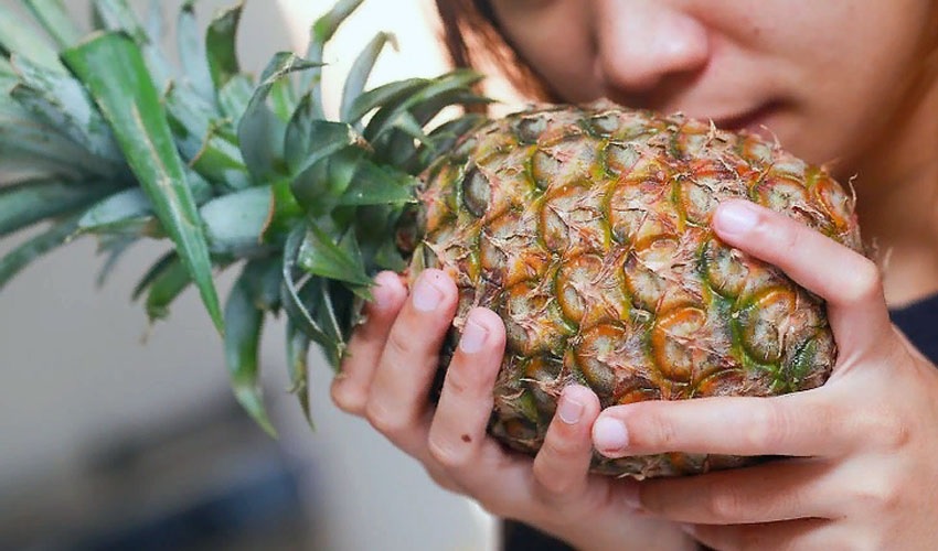 - Ananasbladene presses tett inn i hånden og vrides forsiktig. Hvis frukten er valgt riktig, vil toppen lett skille seg fra kroppen. En del av stilken skal forbli nederst.