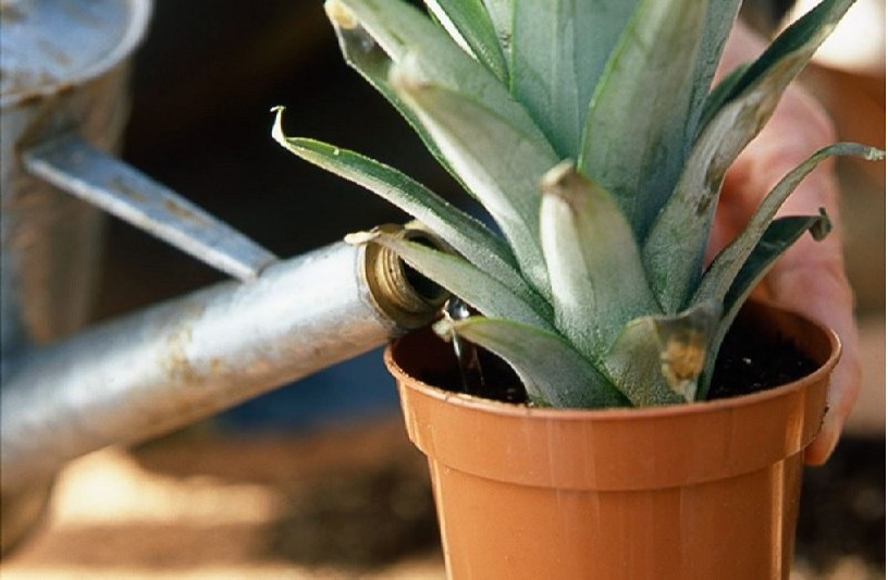 - Tatt i betraktning hvor ananas vokser, skaper de gunstige forhold for planten. Gryten med toppen legges i en pose. Den fjernes regelmessig for å ventilere. Posen fjernes helt når ananas er godt etablert.