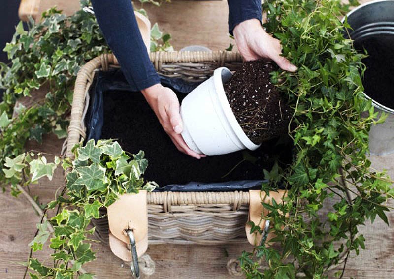 Med utseendet til sine egne røtter transplanteres eføy i en bolle.