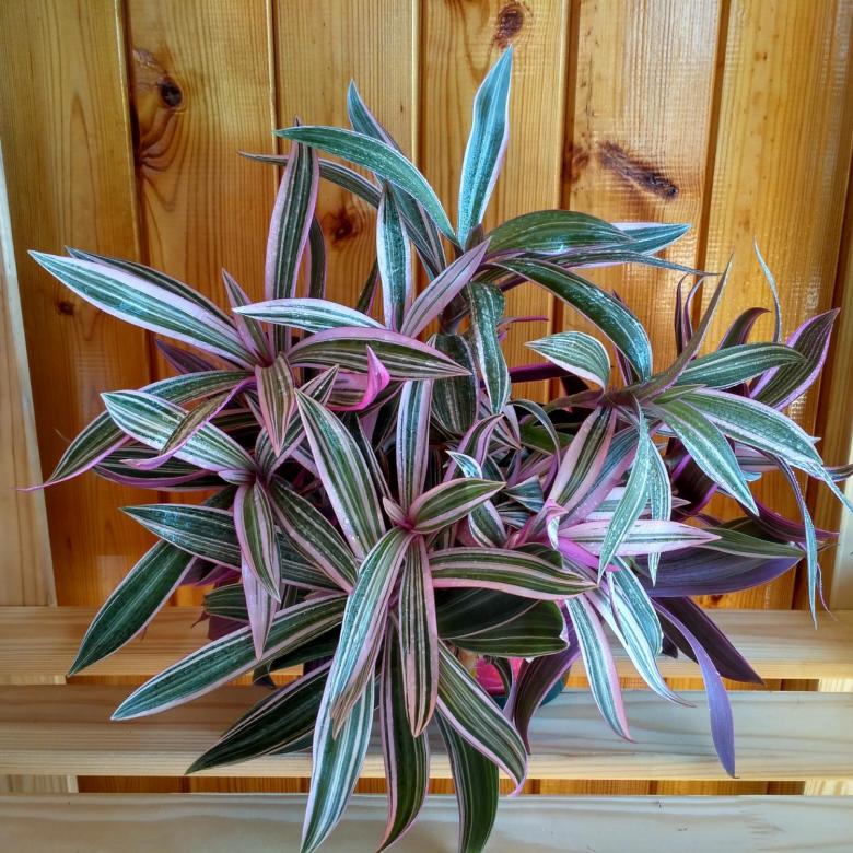 I nærvær av artsmangfoldet til den fulle planten, som er preget av fargene på bladplatene. Fiolett eller grønn lansettformet løvverk med sølvfargede eller lysegrønne striper, noen ganger pubescent.