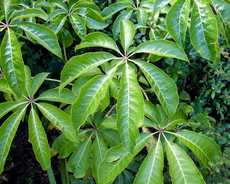 Stammen til et lite tre kan enten være forgrenet eller oppreist. Unge stilker er grønne i fargen, som blir brun over tid. Kutt i mange deler, bladplater kan bli opptil 20 cm lange. Noen varianter har gule, beige eller hvite flekker på bladverket.
