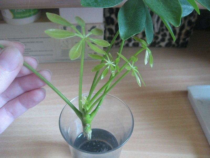 Skuddene er høye, men ikke for tykke, noe som gjør at du kan dyrke flere eksemplarer samtidig i en gryte. Som et resultat kan en felles stamme dannes, bestående av sammenflettede grener av unge shefflers. For et enkelt skudd trenger du støtte, ellers risikerer blomsten å bryte under vekten av sitt eget løvverk.