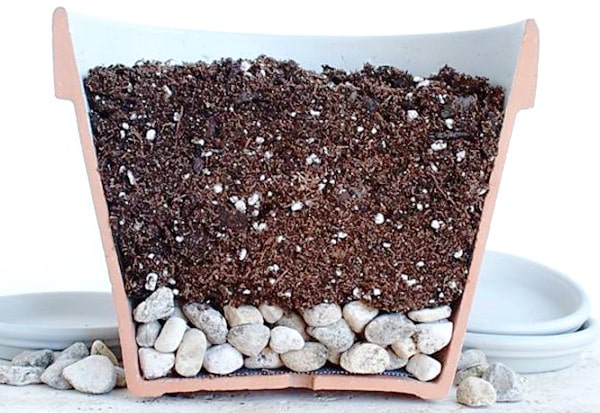 Før du legger den ferdige blandingen i potten, anbefales det å legge ut et 2-3 cm utvidet leirdreneringslag i bunnen. Formen på potten kan være klassisk, hvor høyden og bredden er lik, eller diameteren kan være litt bredere enn høyden.