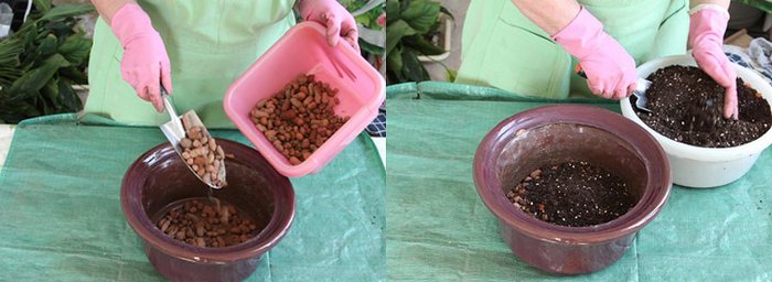 - når vannet er absorbert, blir planten forsiktig fjernet, røttene undersøkt og brukt drenering valgt.