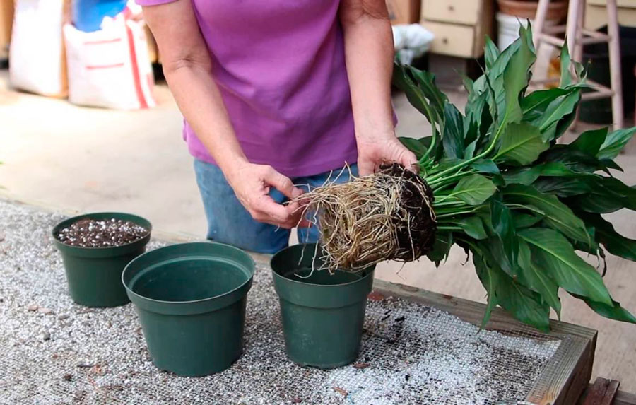 - Ta ut spathiphyllum fra potten og rist jorda forsiktig av røttene;