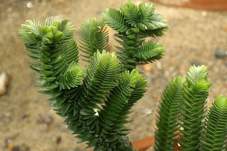 Denne typen "pengetre" ser ut som volumetriske nåler. Tynne, skarpe blader ligner veldig på nålene til en gran. Oppreist busk, godt forgrenet. Mørkegrønne saftige blader 2-3 cm lange ligger overfor hverandre.