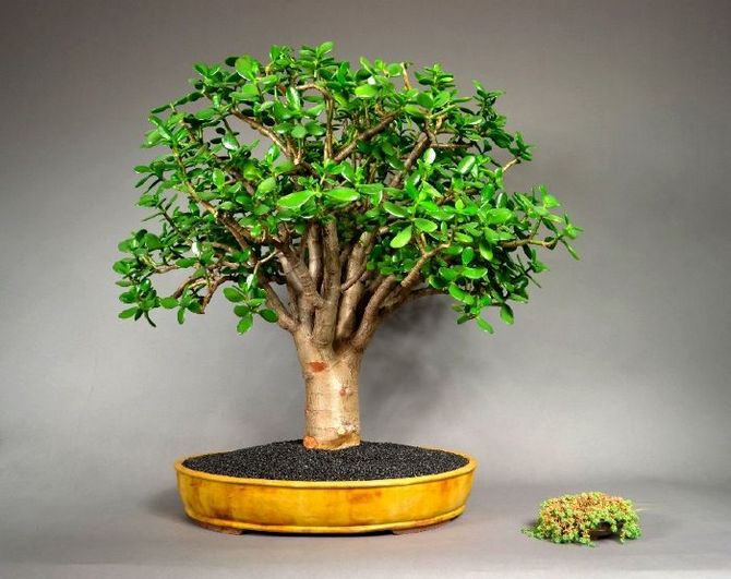 Fett Ovata er den vanligste blant leilighetsrepresentanter. Den forgrener seg godt, stammen blir brun etter hvert. Bladene er mørkegrønne, blanke.