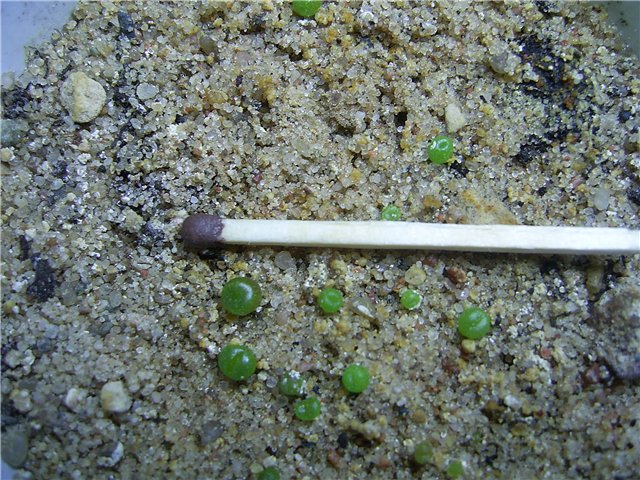 Når alle frøene fordeles over overflaten, drysses de med et lag med sand på ikke mer enn 2 mm. På denne måten kan du plante sukkulenter med både store og små frø.