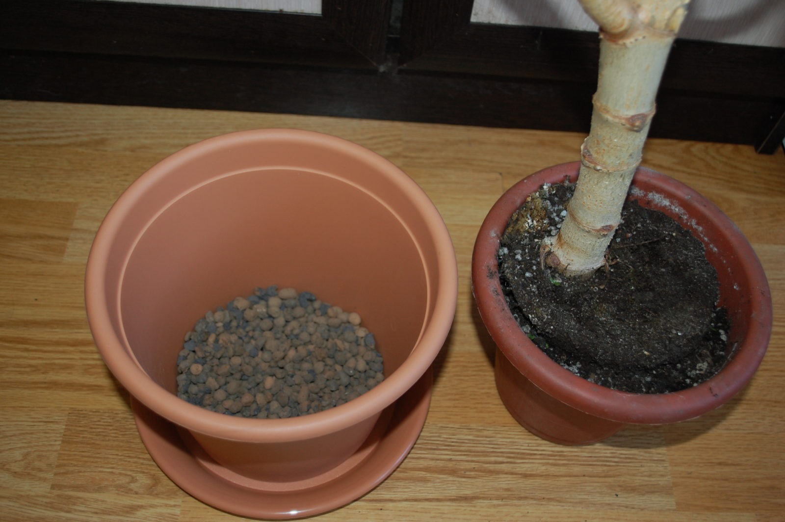- Forbered potter for transplantasjon, som er 5 cm større i diameter enn forrige fartøy. Det kreves mer volum for videre utvikling av rotsystemet. Ikke ta en gryte som er for romslig, da fuktighet vil samle seg i den. Dette vil føre til at planten råtner fra vanntett. For planting, bruk en beholder der det er minst ett dreneringshull.