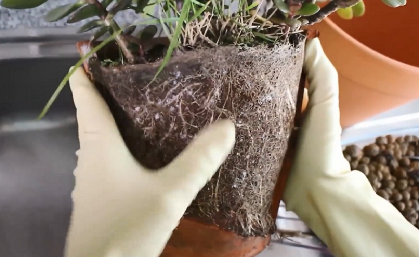 - Pengetreet tas forsiktig ut av den gamle gryten for ikke å skade rotsystemet. Jorda langs kanten av potten er lett trimmet med en kniv. Deretter snur du beholderen og holder planten ved bunnen av stammen og trekker den forsiktig ut.