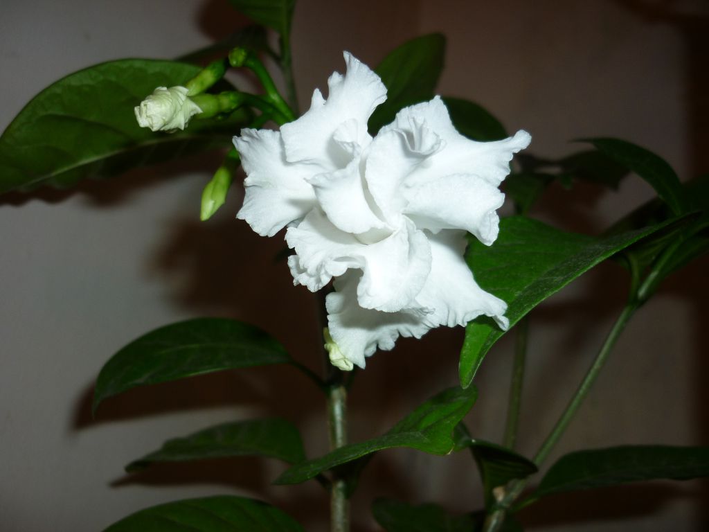 Den innendørs tabernemontana-blomsten ser ut som et miniatyrtrær eller en busk. Skuddene og stammen på blomsten er treaktige. Blomstene er hvite, med doble kanter på kronbladene. Knoppene blomstrer hele året og vokser på toppen av skuddene.