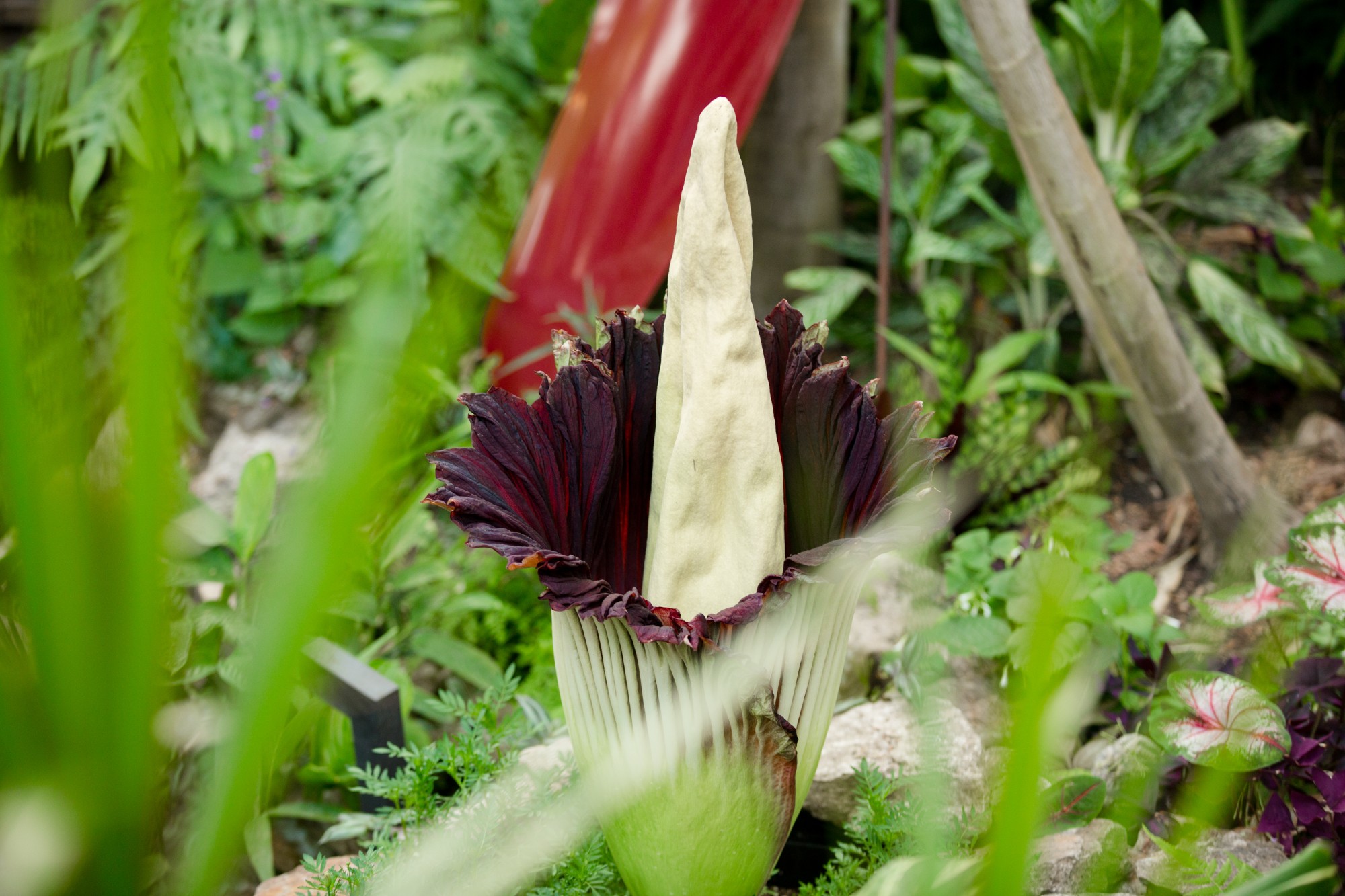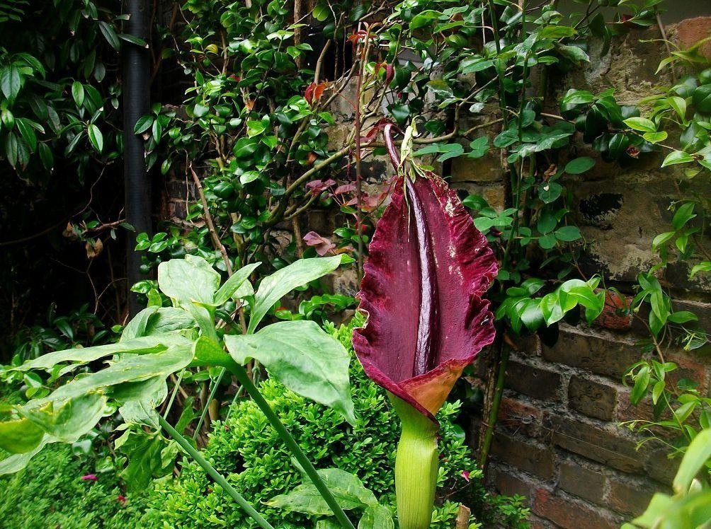 Derav de mange navnene: kadaverblomst, amorfofallus, slangepalme, voodoo-lilje. Et av kallenavnene er djevelens språk.