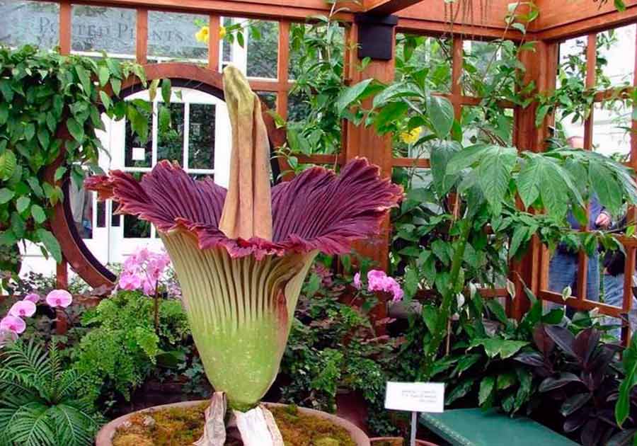 - Amorphophallus titanic eller titanium. Drivhusplanten oppnås ved valg. Det ser ut som en enorm omvendt bjelle opp til 3,5 m i diameter og opptil 2 m høy. En gigant vokser fra en knoll som veier 20-25 kg.