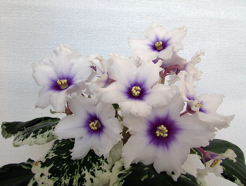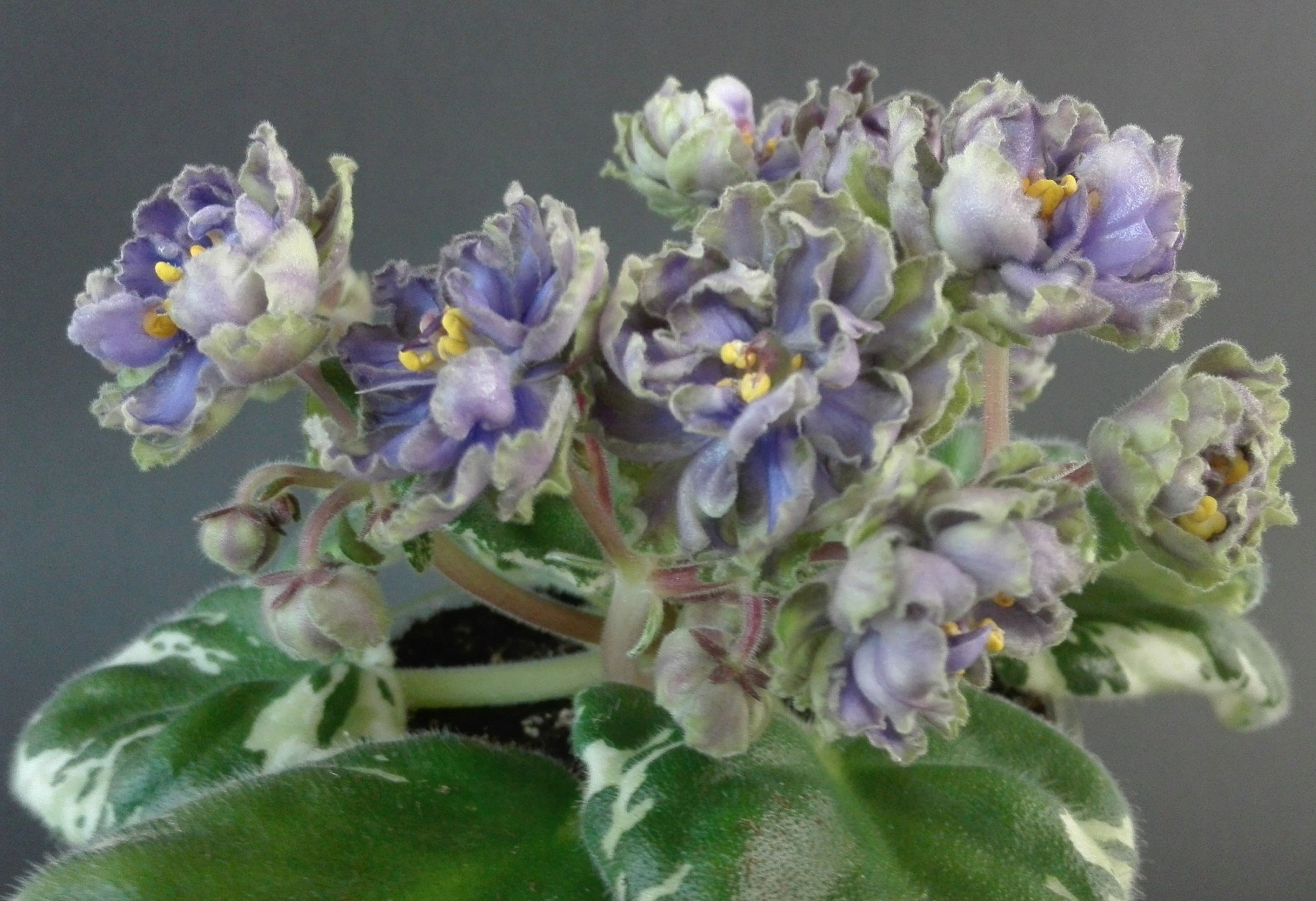 Young Le fiolett med kremblå blomster med blå årer. Kantene på hvert kronblad er bølgepapp, noe som gir knoppene prakt og ømhet.