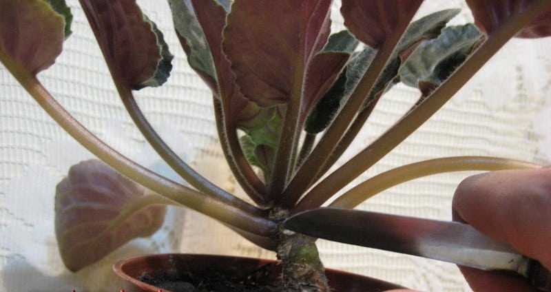 Et annet godt spørsmål er: Skal du plukke av de nedre bladene av fioler? Med saftige og kjøttfulle blader vil dette ikke skade. Men hvis planten er svak, og bladene allerede er gamle, er forholdene ikke passende. Å holde bladene eller beskjære dem hjelper ikke. Trenger en nødtransplantasjon eller tar et sunt blad for forplantning.