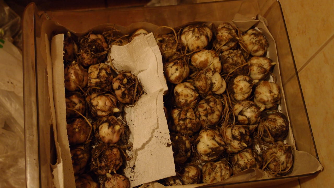 Ta først ut en jordklump og demonter den forsiktig, og trekk forsiktig ut pærene. Store prøver skal skylles under litt varmt og rennende vann, og deretter kuttes skuddet 5 cm fra pæren. Etter det må alt settes i en beholder og fylles med kaliumpermanganatoppløsning i en halv time. Nå må du la pærene tørke i frisk luft i to timer. I løpet av denne tiden kan du forberede sagflis og mose ved å legge dem i en plastpose. Pærene blir også satt der. Alt innholdet blir ført til kjøleskapet eller kjelleren. Dette vil holde pærene til de blir plantet.
