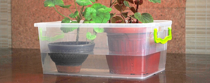Vekke-vanningsteknologien er enkel. Når du transplanterer pelargoner, blir det laget dreneringshull i bunnen av potten, og en streng blir tredd gjennom dem. Det er viktig å fortynne jorden med torv slik at fukt lettere kan passere til plantens organer. I en beholder (det er mer praktisk å bruke en blomsterpotte av plast) samles det avgjort varmt vann, men ikke helt til kantene. Veken dyppes vertikalt i vannet.