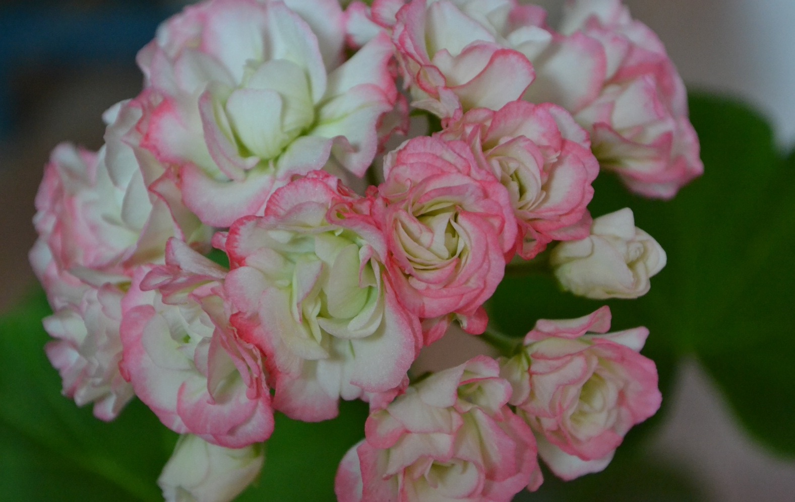 Denne varianten av pelargonium preges av elegante flekkete kronblad. De snøhvite blomstene er dekorert med rosa kanter og flekker. Bladene er elegante, lyse grønne.