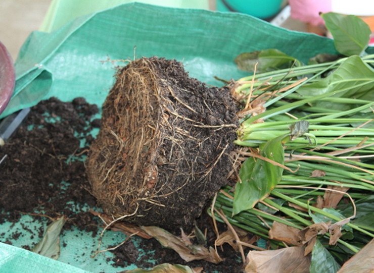 For å takle problemet må du trekke planten ut av beholderen og rengjøre den for overflødig jord. Etter det, skyll røttene under en strøm med varmt vann og erstatt jorden. Tilsett en liten mengde vermikulitt eller perlit til det ferdige underlaget. Dette vil bidra til å gjøre det lettere og løsere. Etter det kan du transplantere spathiphyllum.
