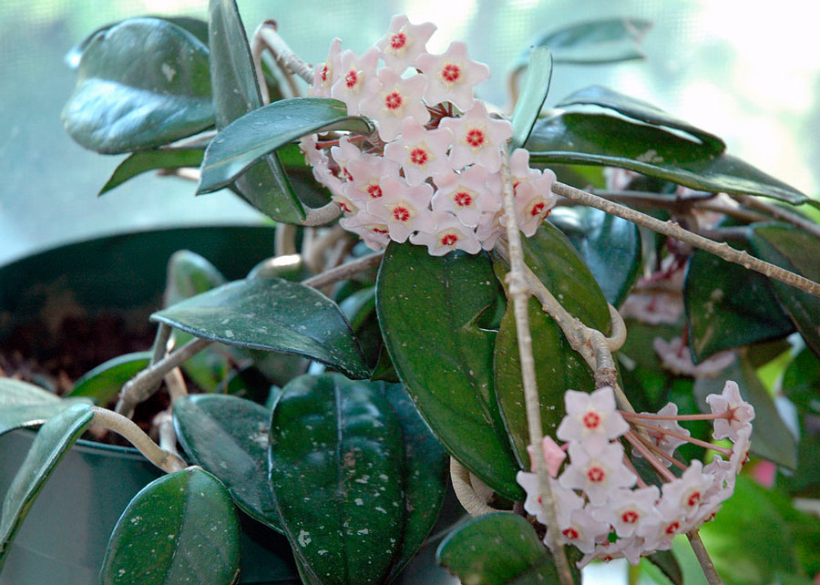 Hoya-blader er tette og voksete. De har forskjellige former, avhengig av plantetype. Kan være ovalt, hjerteformet eller eggformet. Fargen er grønn med små lyse flekker. Den har blomster med fem kronblader, de vokser som paraplyer.