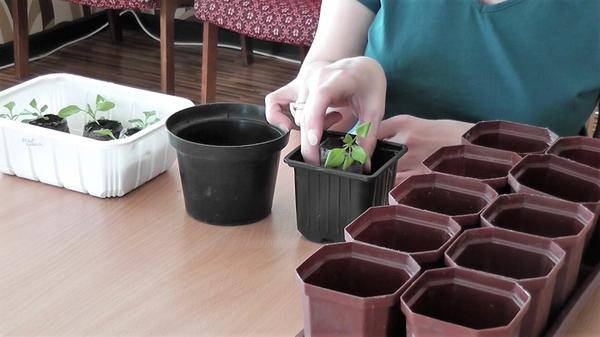 Frøplanter dyrket av frø er små, først plantes de i en liten midlertidig beholder. Størrelsen skal overstige volumet av røttene med 3-4 cm.