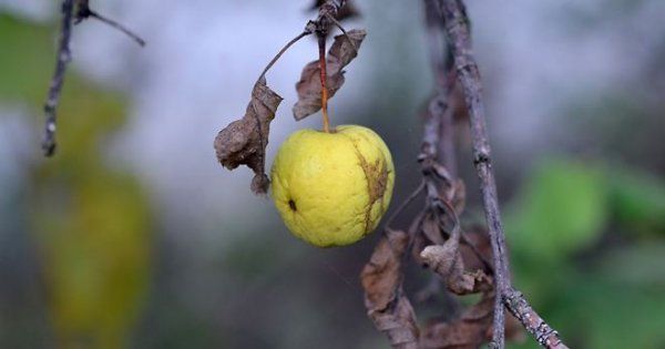 Bladene på epletreet er som brent, krøller seg gradvis, mørkner og tørker ut. Berørt løvverk forblir i denne formen på treet, faller ikke av.