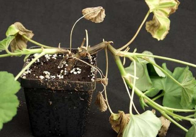For å unngå dette problemet, må du overvåke vanningen og størrelsen på geraniumpotten. Smale beholdere lar ikke røttene utvikle seg fullt, noe som er årsaken til at noen områder av kulturen dør, de kan tørke ut først.