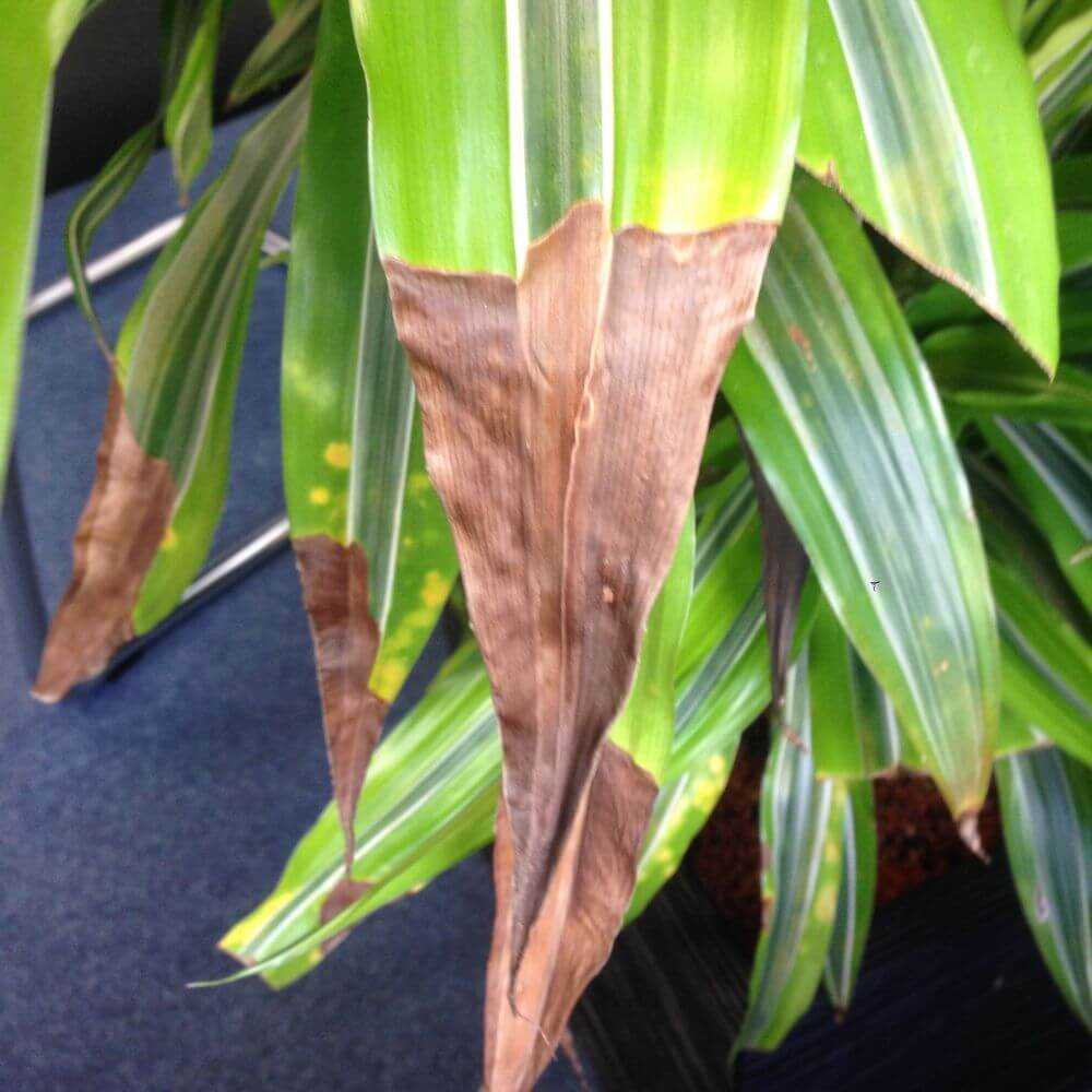 Dette er et av de vanligste problemene som dracaena møter. Fluortoksisitet fremstår som gule bladspisser, kanter og døde flekker. Bladene har mørkebrune og døde områder med gule kanter.