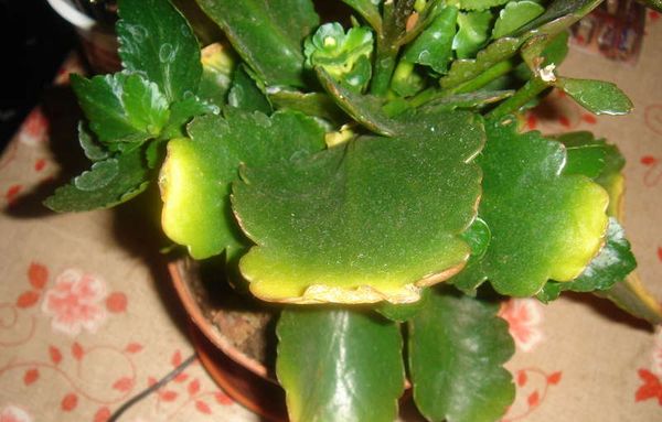 En annen vanlig sykdom som Kalanchoe er utsatt for, kalles senbrann. Uregelmessige brune flekker begynner å dukke opp på planten. Spissen av bladene tørker opp og begynner å krølle seg. Hovedårsakene til denne sykdommen er: