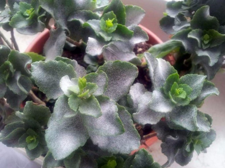 Med utviklingen av pulveraktig mugg dukker det opp hvite flekker på bladene. Denne sykdommen er forårsaket av for varm og tørr inneluft. Hvis det dannes plakett på bladene på Kalanchoe, betyr dette at planten må vannes ofte og flyttes til et kjøligere sted.