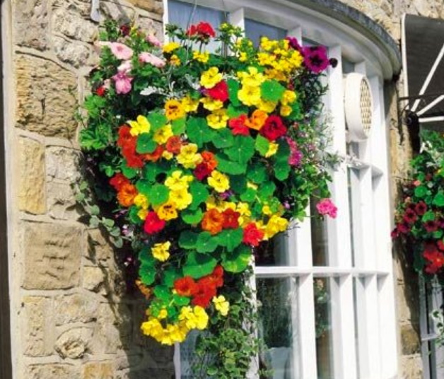 På grunn av det attraktive utseendet - glatte, semi-doble eller doble blomster og grønne, voksede blader, blir det rikelig med nasturtium dyrket i hengende potter for å dekorere balkonger og verandaer. Fargen på kronbladene domineres av nyanser av hvitt, gult, rødt, oransje-rosa.