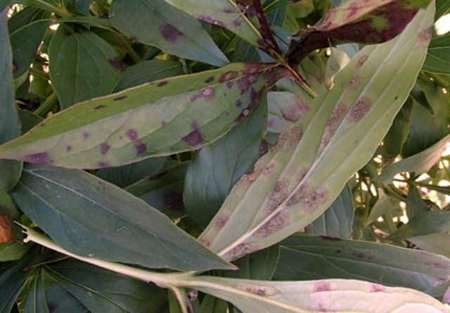 Nærmere juli kan sporulering av sopp finnes på planter som raskt sprer seg gjennom bushen. Knoppene til pioner tørker ut sammen med løvet. På bakgrunn av sykdommen er den dekorative kulturen ikke i stand til å tåle vinterfrosten. Sopp overvintrer på løvverk som har falt av. For å takle sykdommen er det verdt å behandle buskene med en løsning av Bordeaux væske, som skal gjøres i henhold til instruksjonene.