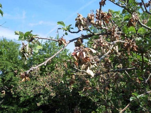 - Tilstedeværelsen av fallne blader og frukt under treet. Utidig høsting av fallne avlinger, som også ble smittet, vil føre til infeksjon av den fremtidige avlingen. Dette skyldes at sporene tåler veldig bra selv lave temperaturer.