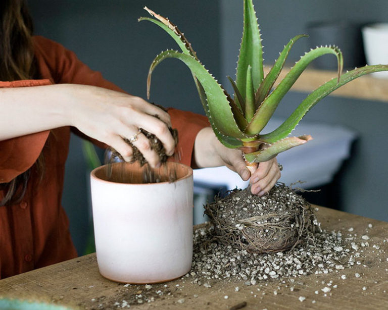 - Plante aloe i midten av potten, komprimer overflaten.