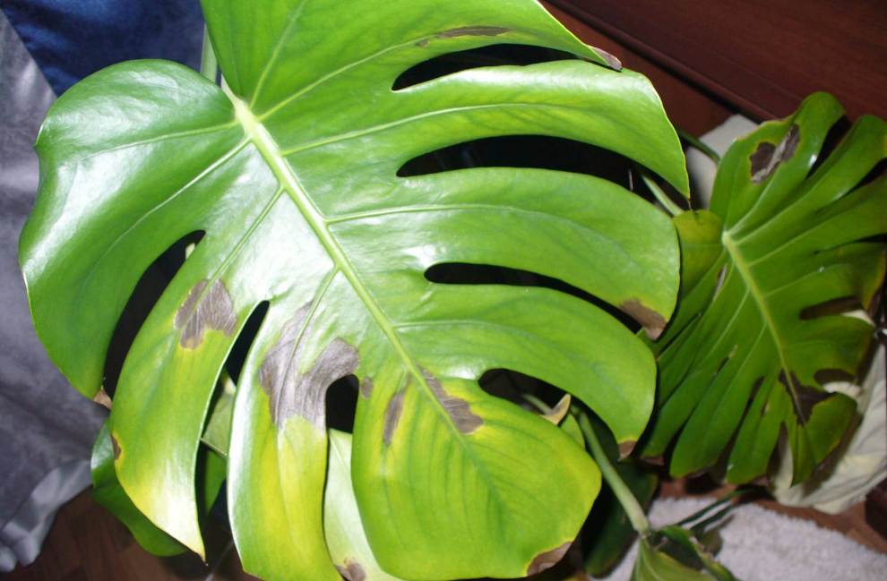 Sammen med gule flekker vises ofte brune flekker. Hvorfor blir monsteras blader svarte, hva skal jeg gjøre i dette tilfellet? Poenget her er også mangel på fuktighet. Det er nødvendig å gi anlegget regelmessig vanning med tilstrekkelig mengde vann. For hurtig utvinning brukes bladsprøyting.