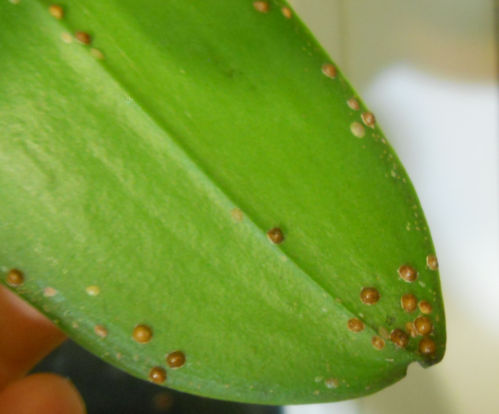 Det er en veldig raskt multipliserende parasitt. Skalaen insekt lever på skudd, luftrøtter og monstera blader. Utad ser det ut som en brun plakett som presses tett mot arket.
