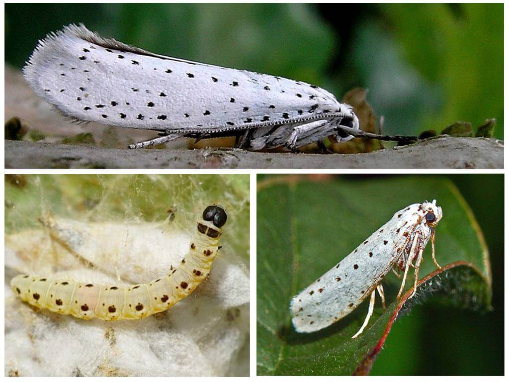Nok et farlig skadedyr i hagen. Eplemøllen legger eggene sine på grenene av epletreet, hvoretter larver senere klekkes ut. Først legger de seg i dvale, gnager barken under dem, og om våren beveger de seg til bladene og skader dem fra innsiden. Som et resultat begynner løvet å krølle seg, blir brunt og tørke opp.