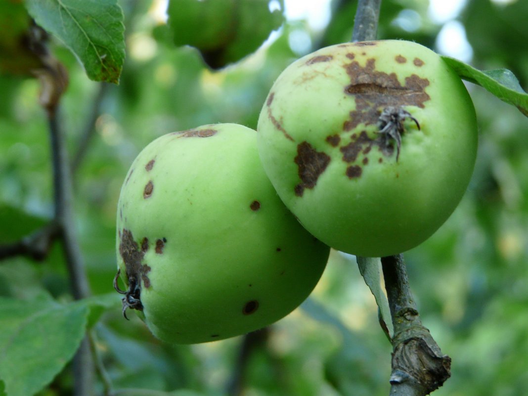 Scab er en type soppsykdom. Sporene bæres under vind og kan smitte alle trær i hagen. Tett og høy vegetasjon så vel som uklippte trekroner er gunstige faktorer for utseende av skurv.