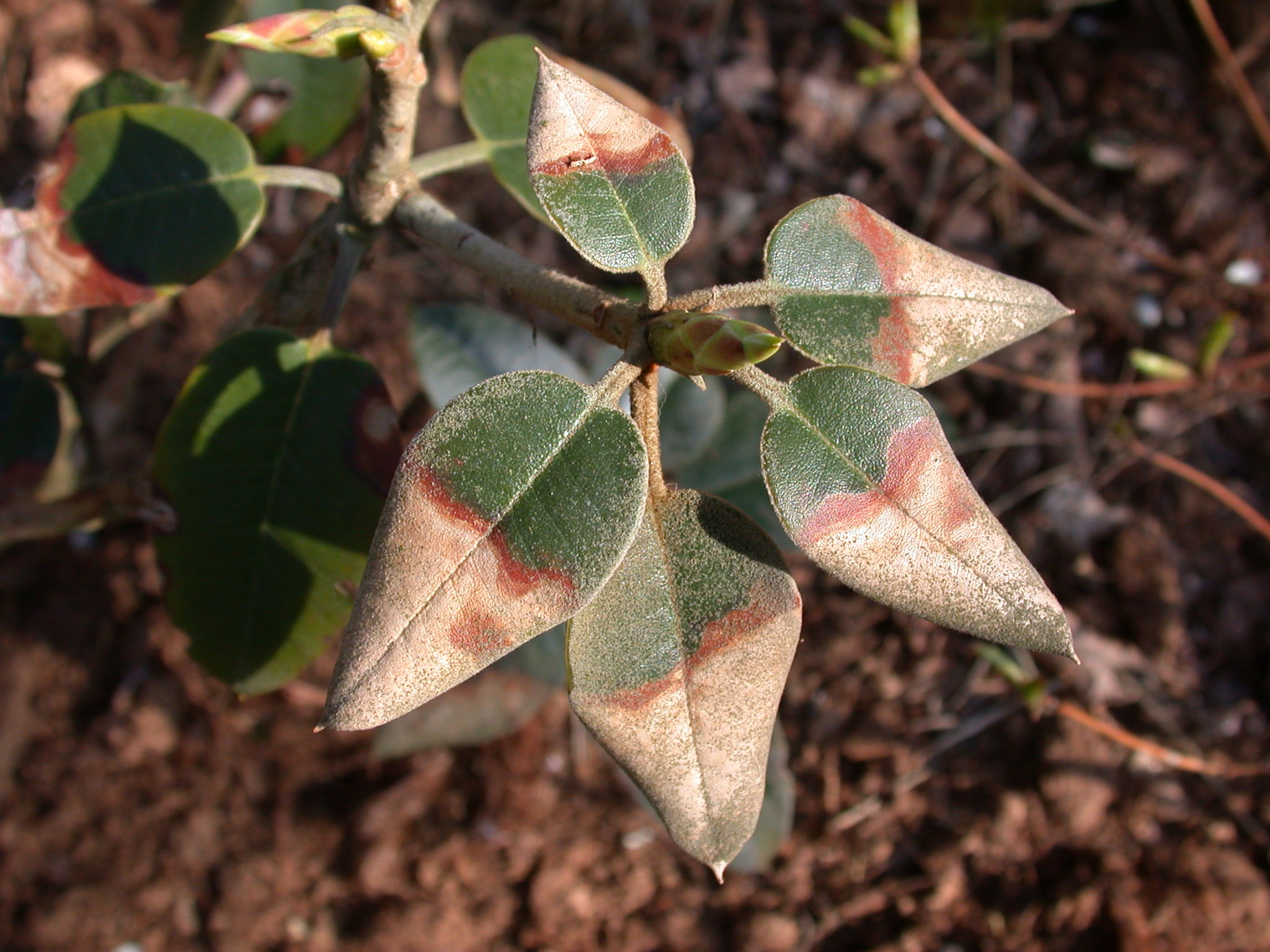 Sykdommen er forårsaket av soppen Gloeosporium rhododendri. Rødbrune flekker med dødt vev vises på bladene. Bladene tørker raskt ut, og det dannes sporer av avrundet form og mørk farge. Gradvis beveger sykdommen seg til stilkene, som tørker ut.
