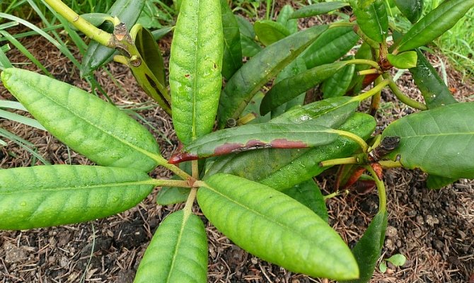 Sykdommen sprer seg til rododendroner, som er plantet i skyggen uten tilstedeværelse av sollys. En sopp fra slekten Phytophtora cactorum Leb sprer seg over blomsten. De viktigste symptomene på sykdommen: