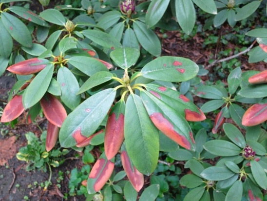 - bladene mister elastisiteten, blir sløv, krøller seg sammen, det vises brune flekker på rododendronen;