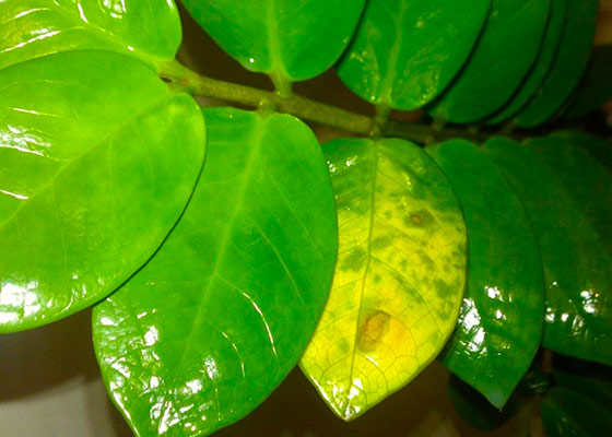 Ved Zamioculcas - blader blir gule, forårsaker sykdommer