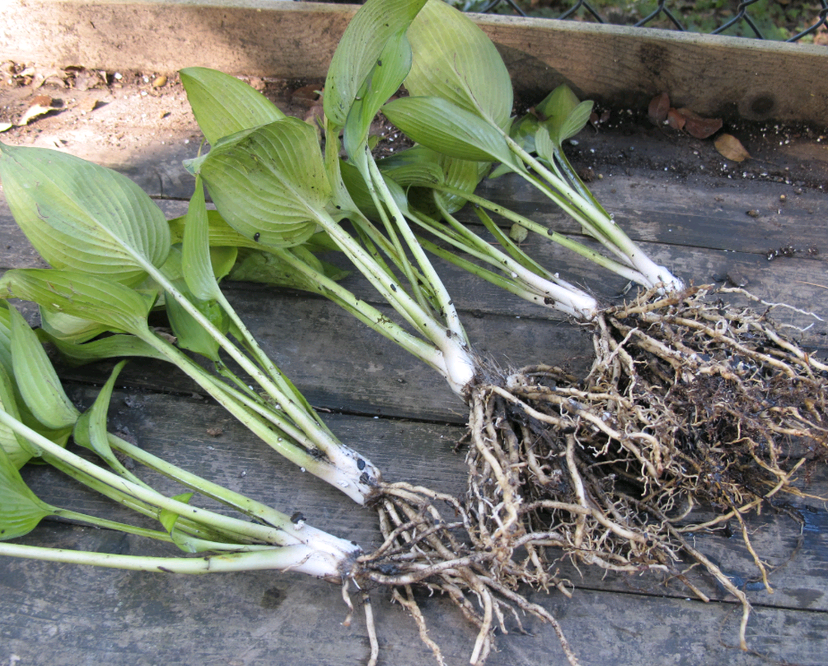 - En voksen hostabusk graves til middels dybde og prøver å komme under rotkulen uten å skade røttene;