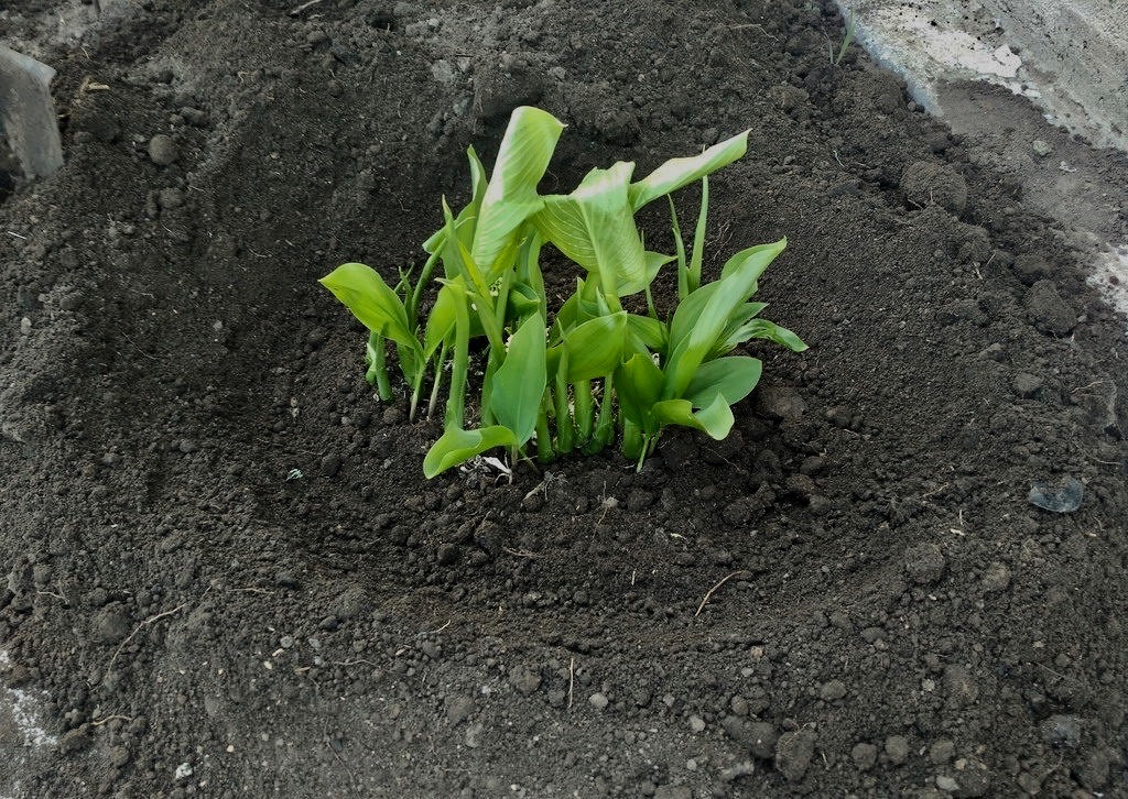 - Et nytt hull blir klargjort basert på størrelsen på jordkomaen. Ved deling - ca 0,4x0,4 m og 0,5 m dyp. Hvis det plantes flere planter, skal ikke hullene plasseres nær hverandre. Verter trenger plass for vekst av rotsystemet, med tanke på den sjeldne transplantasjonen, bør det være tilstrekkelig: minst 0,5 m for storbladede planter, 0,3 m - for miniatyrvarianter;