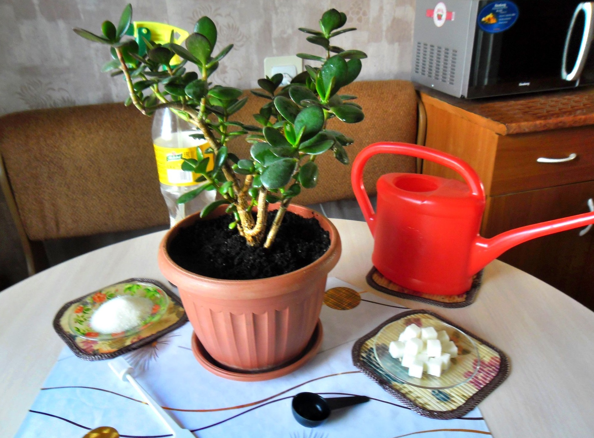 Ovenfor er makronæringsstoffene som kreves av pengetreet. Imidlertid er det også anbefalt et mikroelement for tilsetning av gjødsel. Det er ikke nødvendig for planten å eksistere, men den gagner den. Dette er kalsium. Som hos mennesker, vil dannelsen av riktig skjelett hos en feit kvinne ikke forekomme uten kalsium. Han er også ansvarlig for de riktige fuktighetslagringsfunksjonene til sukkulenten.