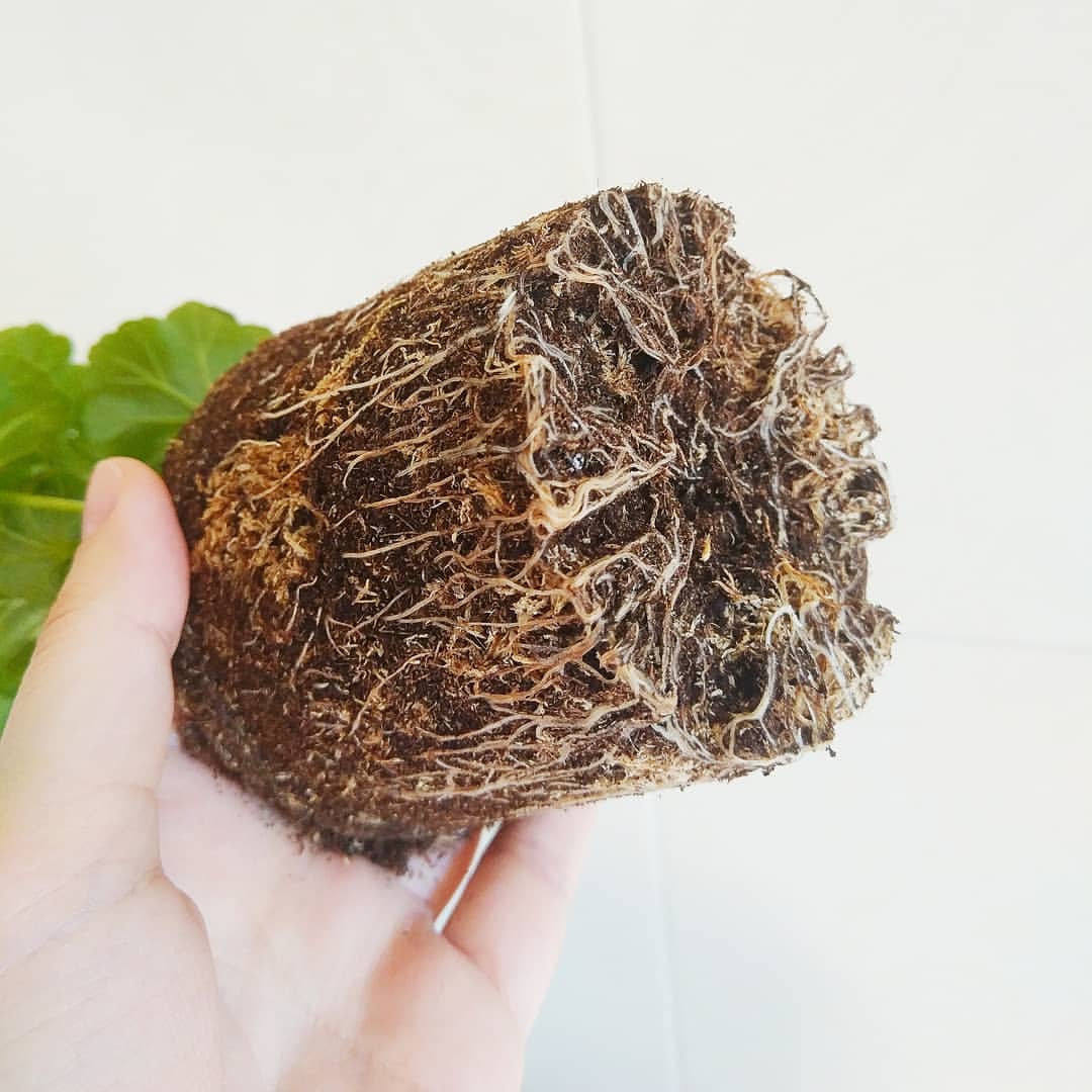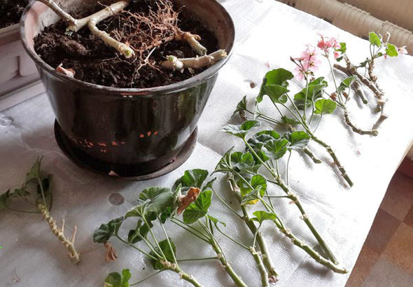 - etter å ha frigjort pelargonene fra potten, rister de jorden fra røttene og undersøker prosessene;