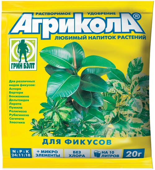- Agricola er en universell gjødsel for forskjellige varianter av ficus. Tilgjengelig i poser og flasker, tørr og flytende konsistens - henholdsvis 100/250 ml.